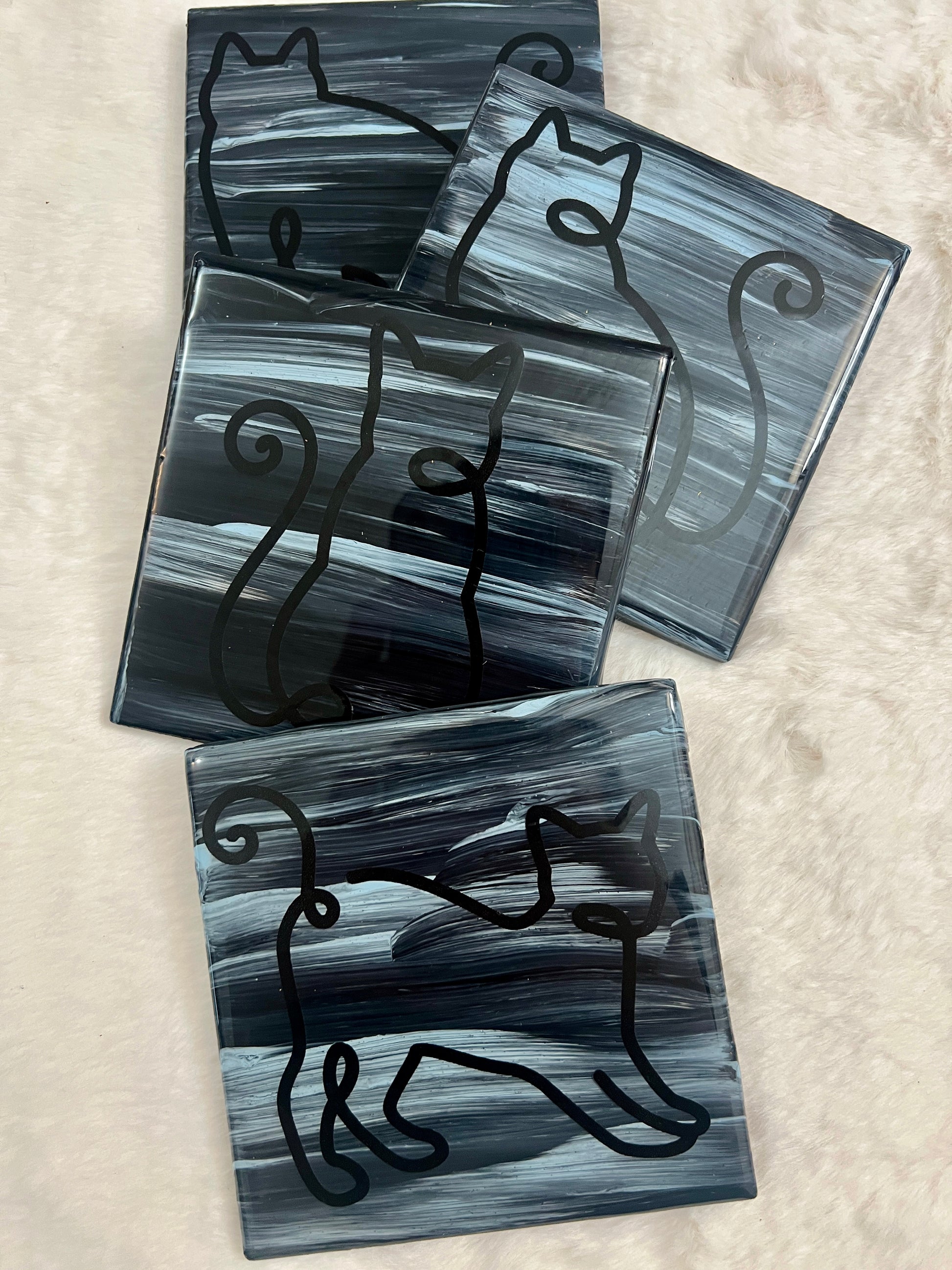 Elevate your tabletop with this refined coaster set, featuring charming feline illustrations rendered in delicate linework. Each piece combines artistic sophistication with practical protection for your surfaces, making them an understated accent for any room. Perfect for the discerning cat lover who appreciates both form and function.
