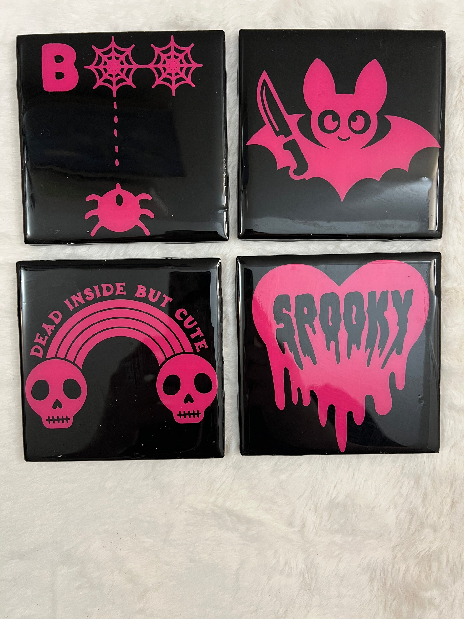 Transform your drink station into a playful haunted hideaway with this delightful coaster set. Featuring charming spooky designs in vibrant colors, each coaster brings a touch of whimsical Halloween spirit to your home year-round. Perfect for protecting surfaces while adding personality to your coffee table, nightstand, or kitchen counter. Whether you're a cat lover, craft enthusiast, or simply adore all things spooky-cute, this set makes a fantastic gift or personal treat. Durable and fun, these coasters prove that seasonal décor doesn't have to wait for October.