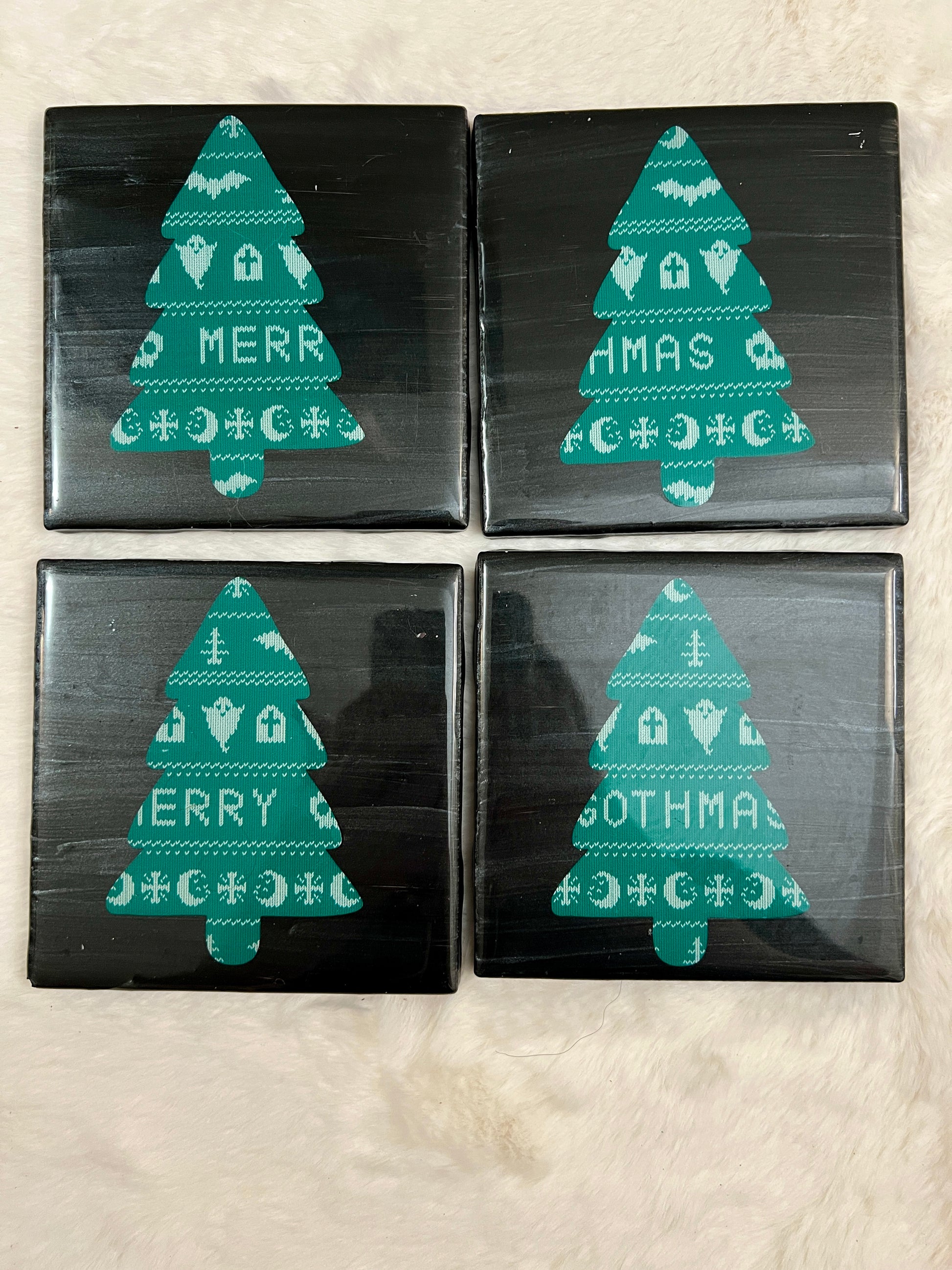 Introducing the Gothmas Tree Coaster Set, perfect for adding a touch of darkness to your holiday decor. Made with a creepy punk design, these coasters are sure to set the tone for any gathering. Keep your table safe while also adding a trendy and unique flair.
